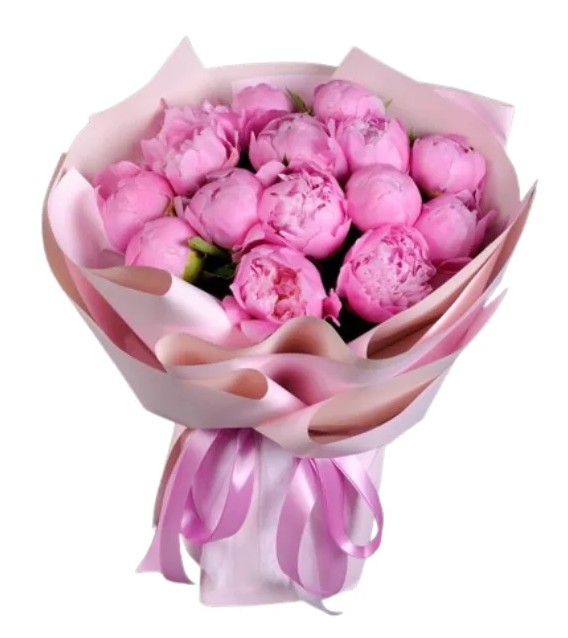 W skład bukietu wchodzą: peonia,papier dekoracyjny, rafia.